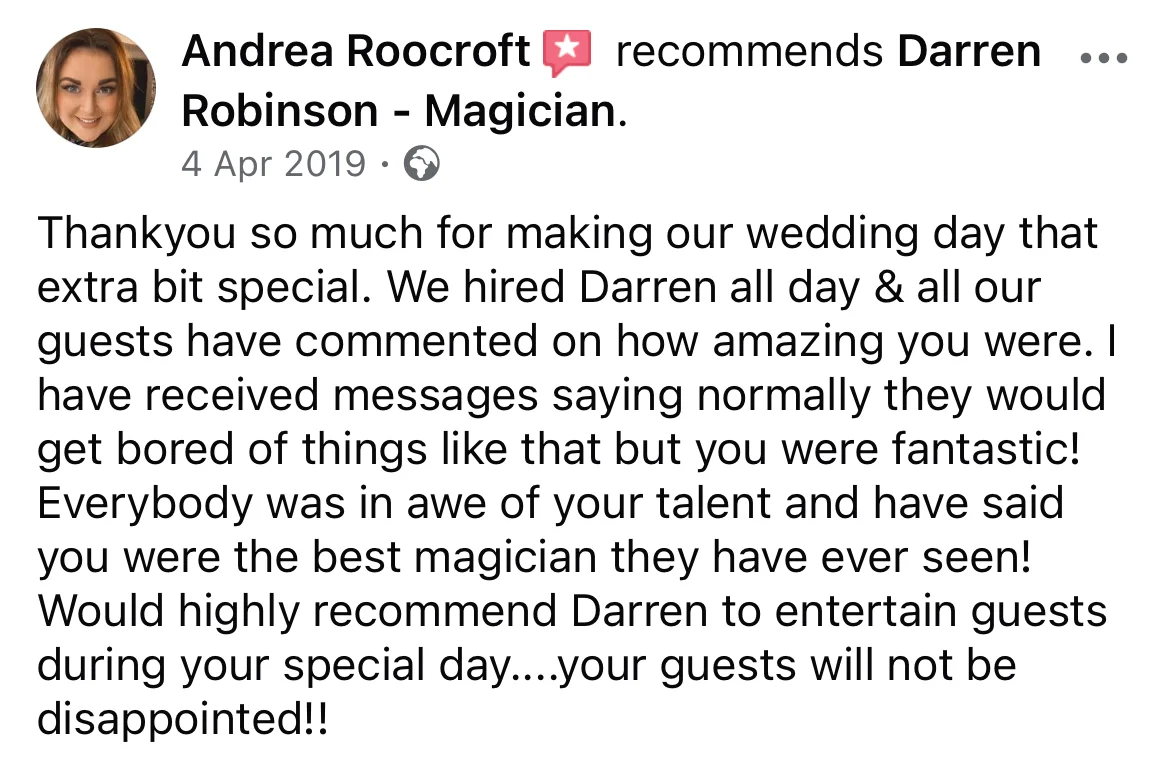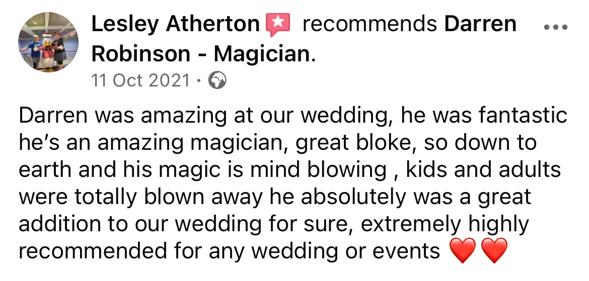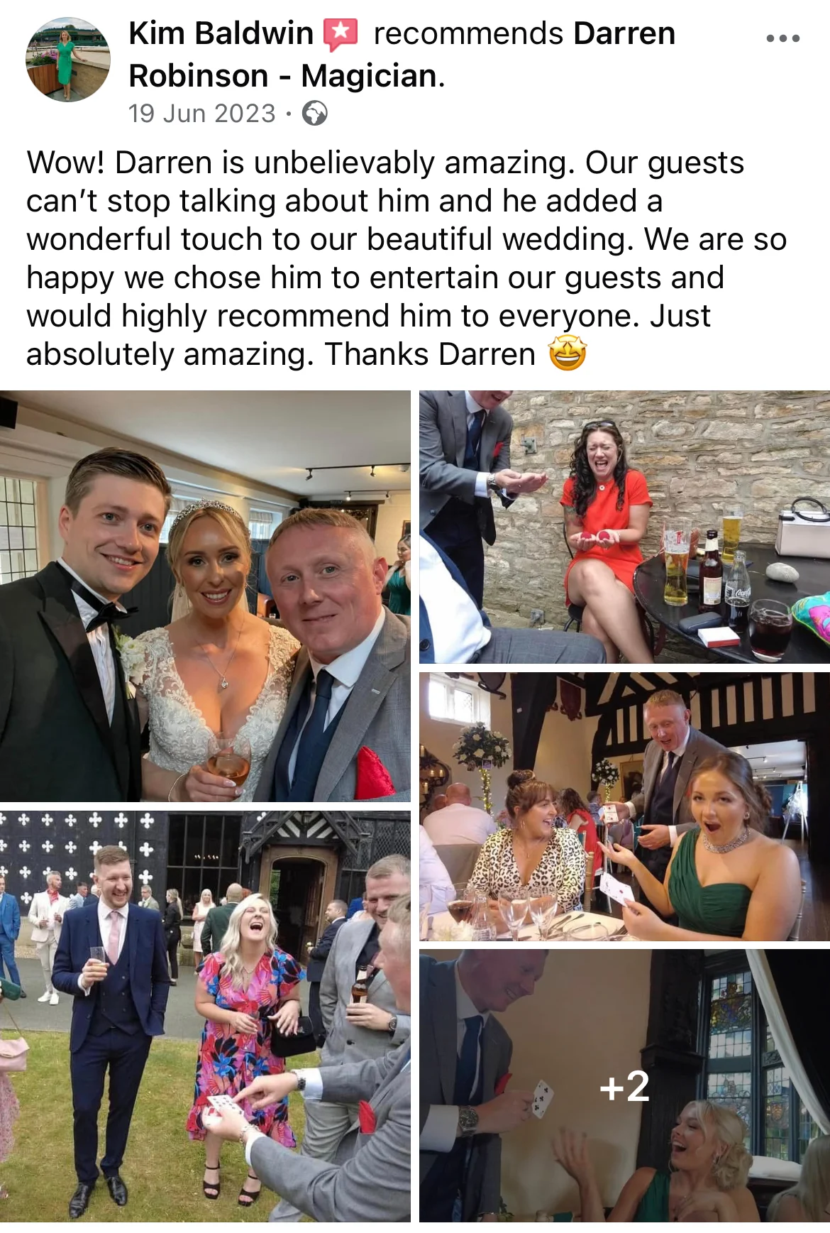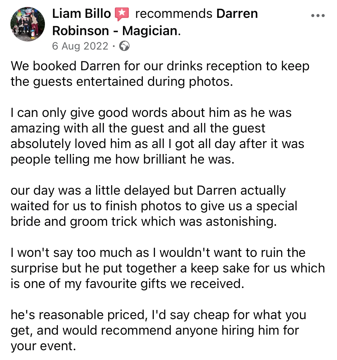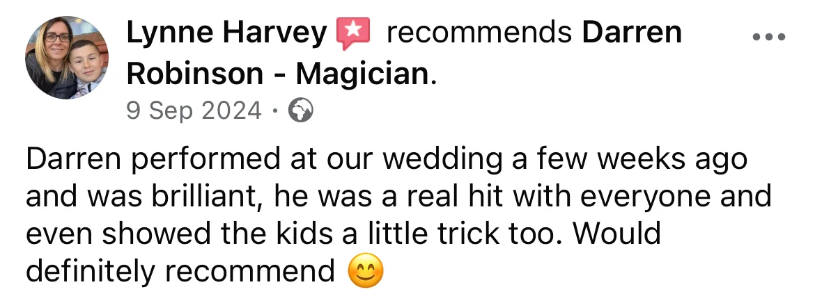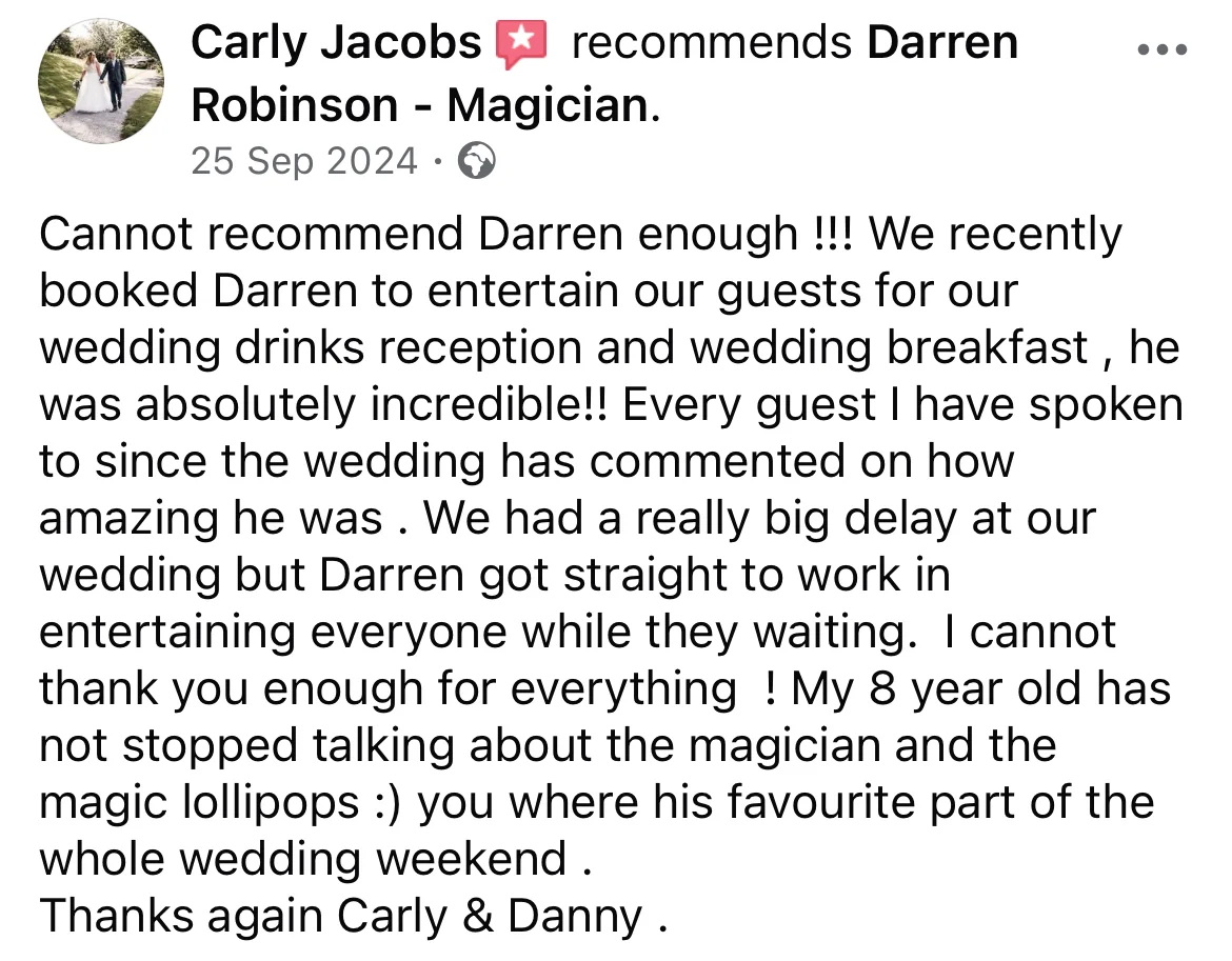 Choosing the right entertainment for your wedding or event is about more than just tricks; it’s about creating moments your guests will talk about long after the event is over. My aim is always the same: to make guests feel included, entertained, and genuinely amazed.