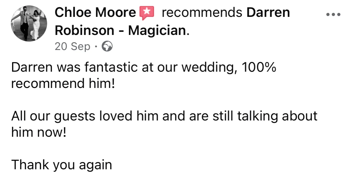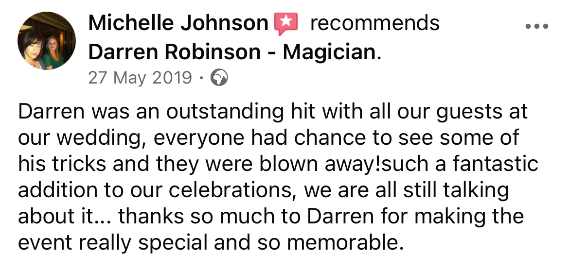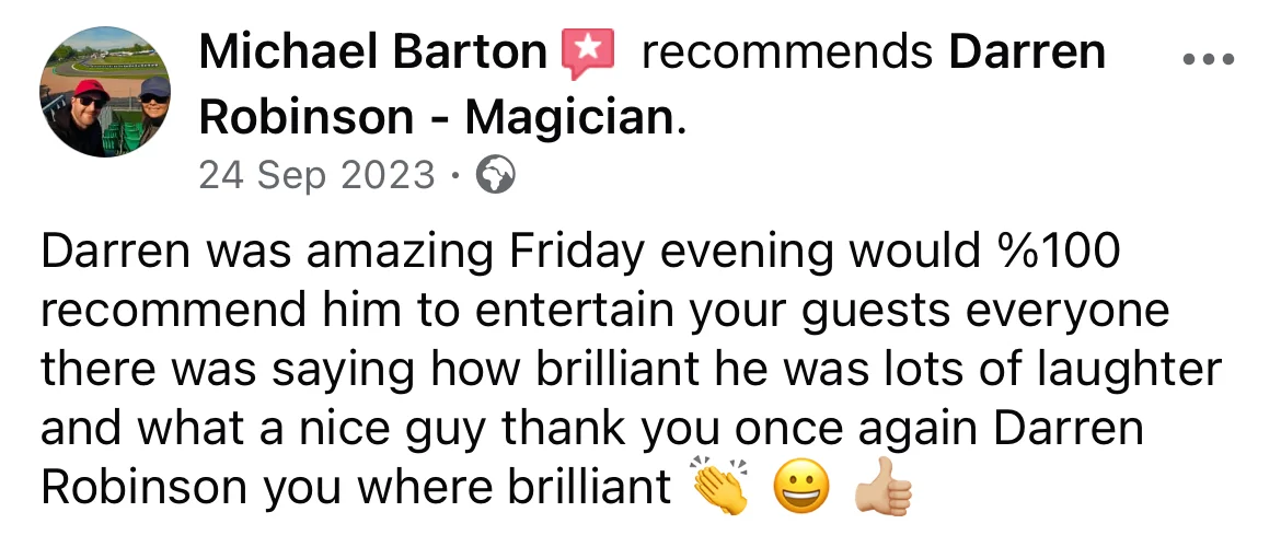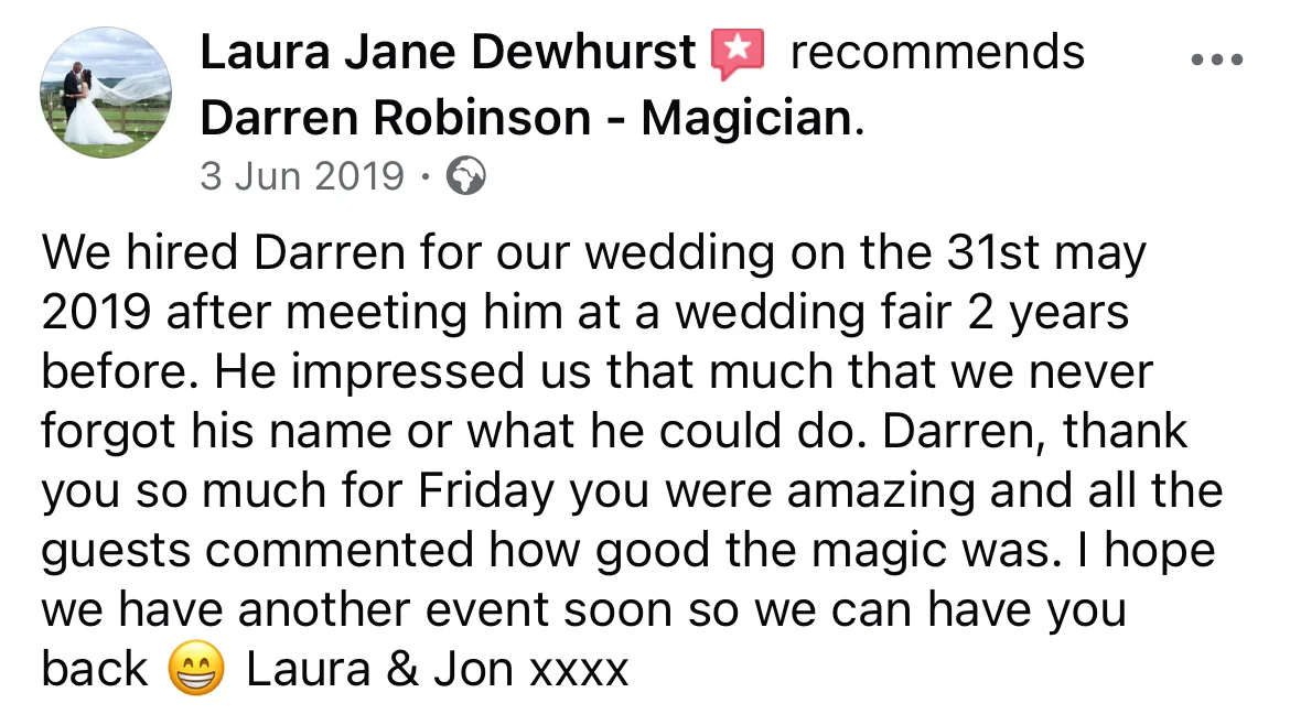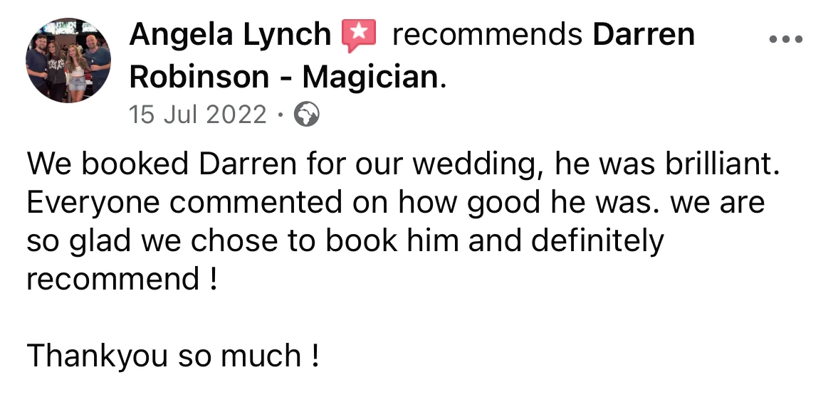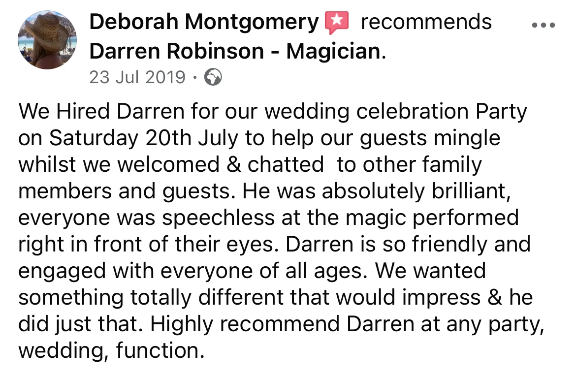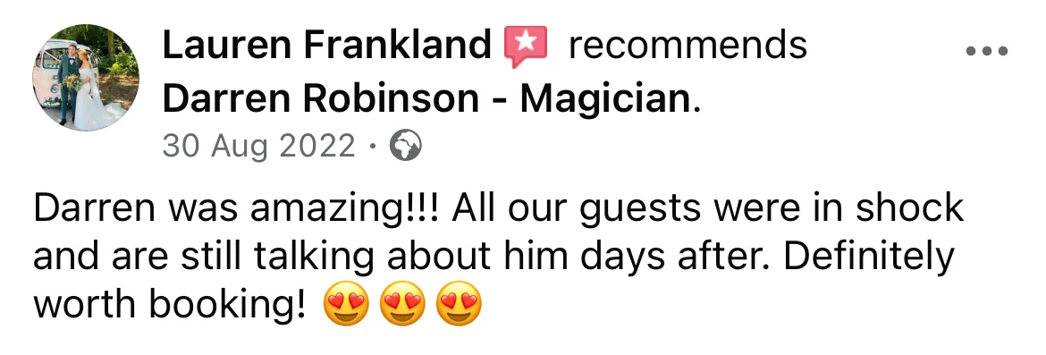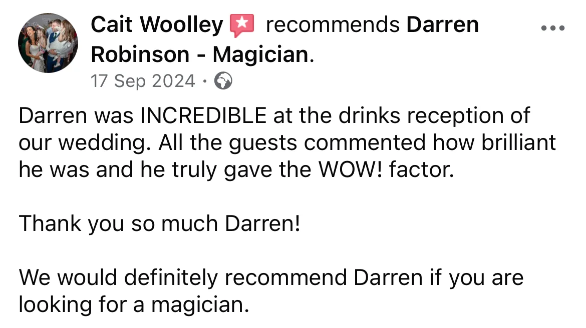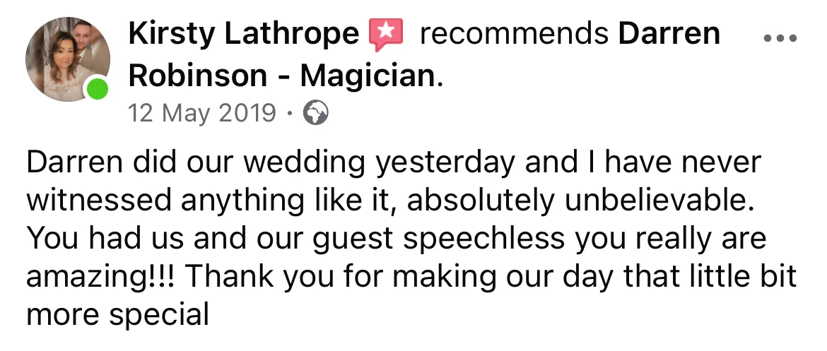 Choosing the right entertainment for your wedding or event is about more than just tricks; it’s about creating moments your guests will talk about long after the event is over. My aim is always the same: to make guests feel included, entertained, and genuinely amazed.