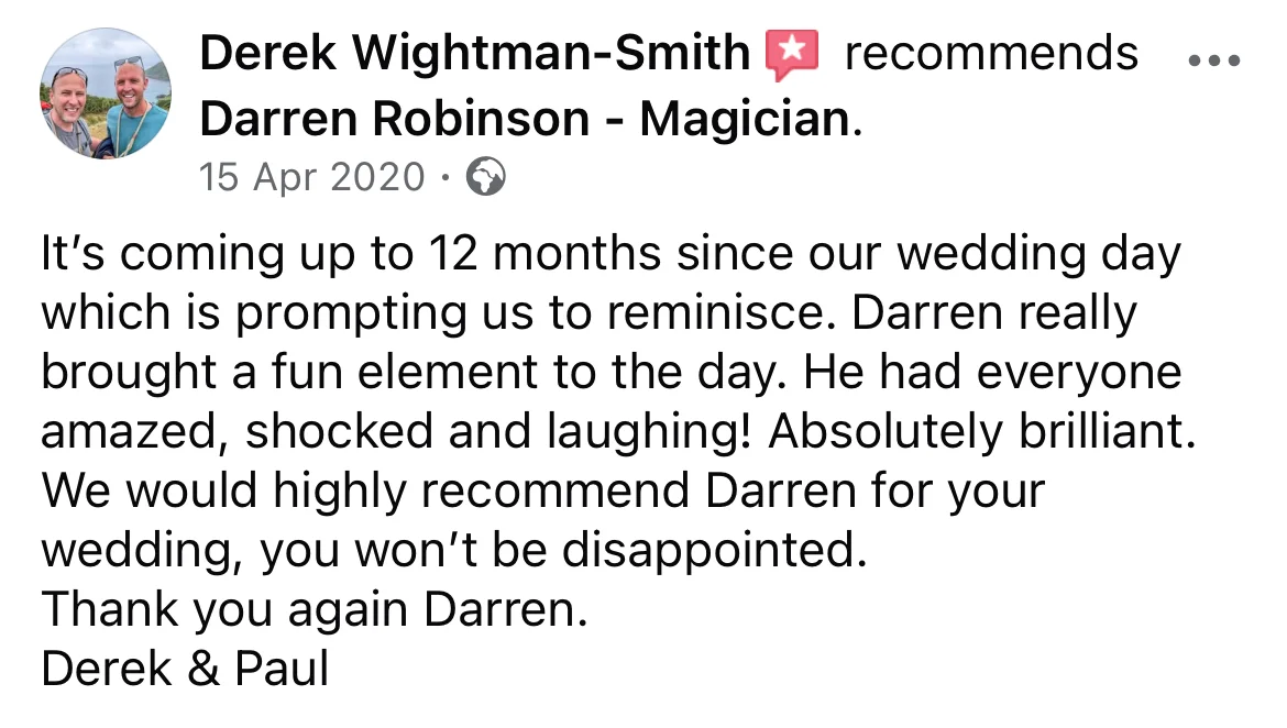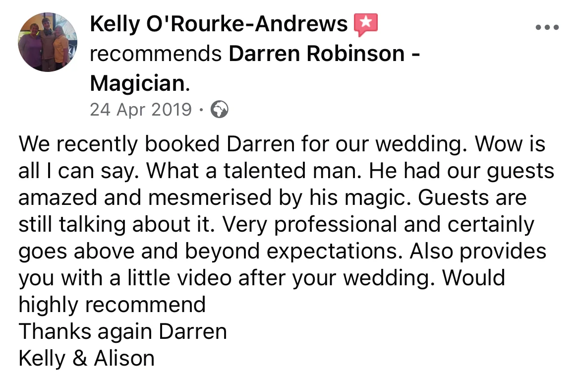 “Darren was absolutely amazing at our wedding, he absolutely helped make our day memorable, so highly recommend!! Thank you so very much!!”